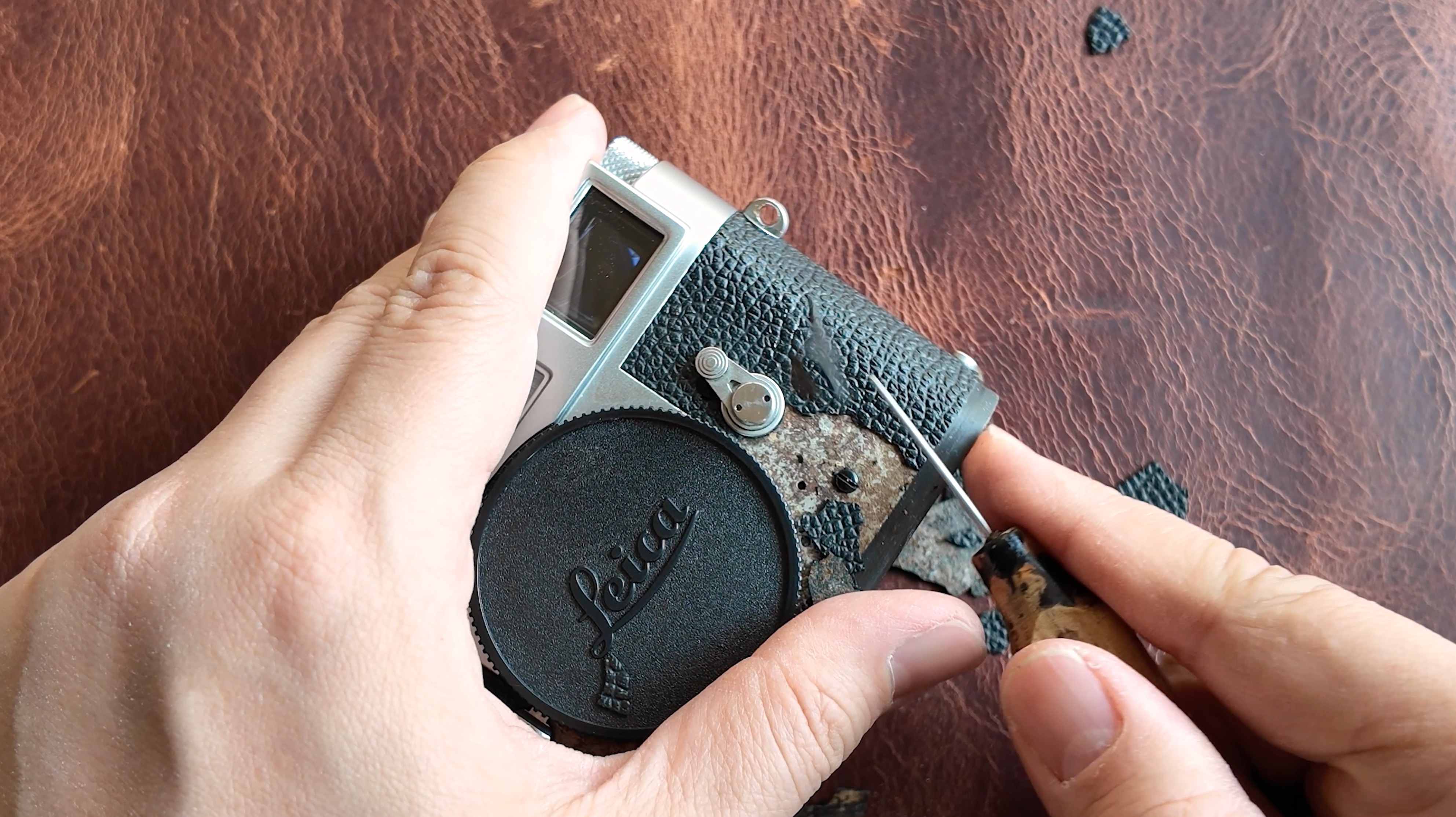 The original skins that come standard with Leica cameras are not real leather. They are made of plastic (Volcanite) with a leather pattern imprinted on it, or faux leather coated over fabric. As such, they can peel, shrink, harden, and crack over time.