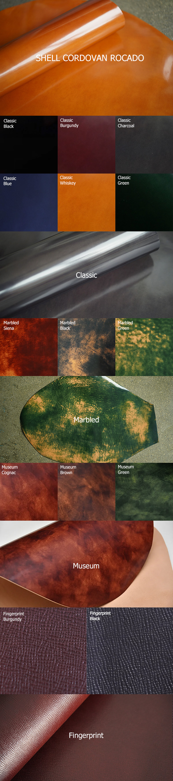 Shell Cordovan Toscana Italia, a cordovan brand originally introduced in Korea as "Italian Shell Cordovan," was once a partner of the company. However, after the company split, the company now maintains the original tannery name, ROCADO, and introduces high-quality cordovan with the rich glazing we're familiar with, along with experimental new articles.